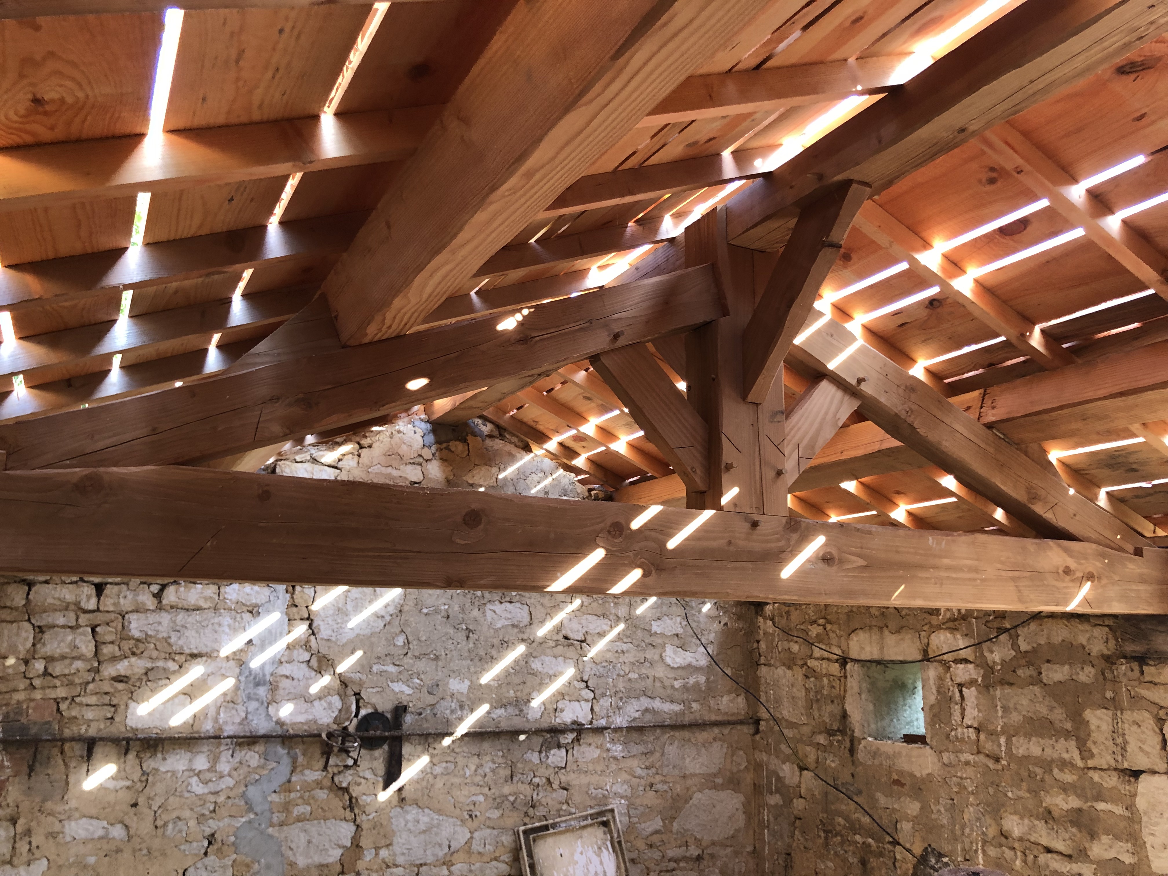 Assidu à travailler ces 2 fermes sur poteaux, l’équipe de l’Atelier Archange s’apprête à bientôt lever leur préau. Celui-ci s’étendra sur 60 m2, fait de poutres en chêne vert issus des forêts françaises, et recouverts de tuiles « canal » traditionnelles. C’est assis sur 2 fermes que l’édifice tiendra, entre les maçonneries… Voici un premier aperçu du