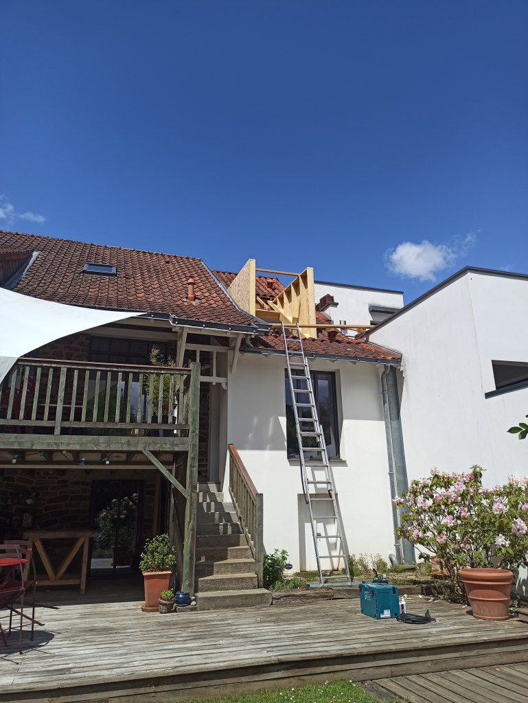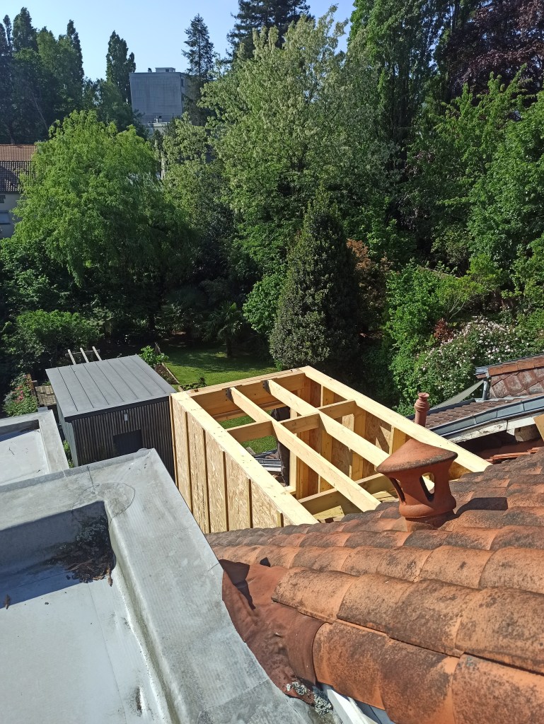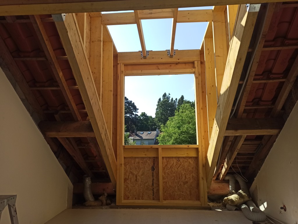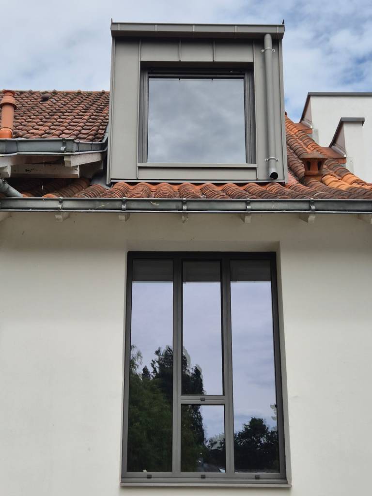 Voici une lucarne appelée « Chien couché » (pas un chien assis !), réalisée par nos soins, pour ressusciter le petit studio indépendant d’une jolie maison.
