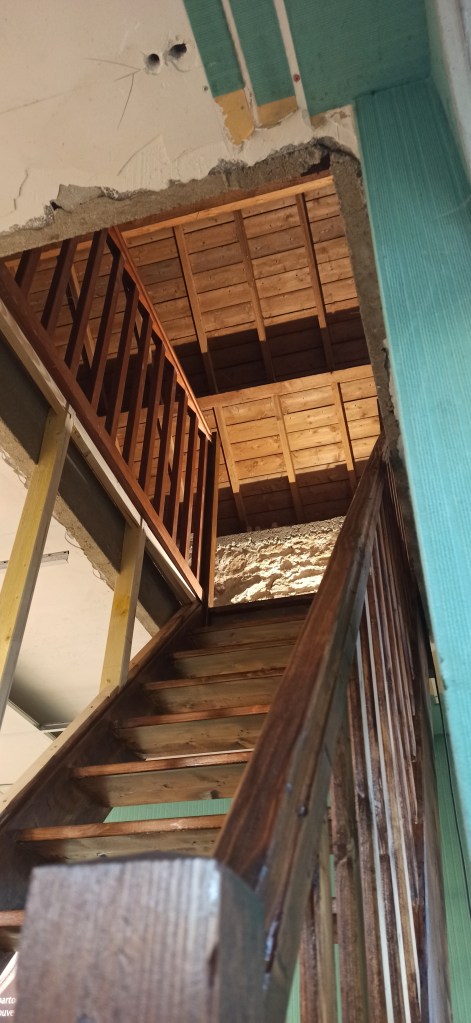 Après emboîtement des marches, des rembardes et des poteaux, c’est le levage, qui vient épouser le plancher à l’étage…