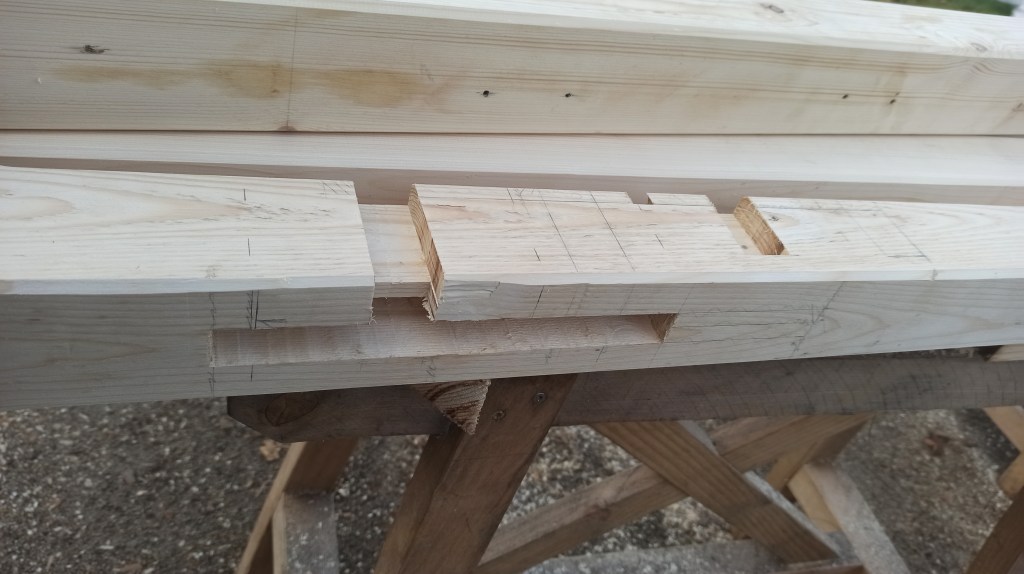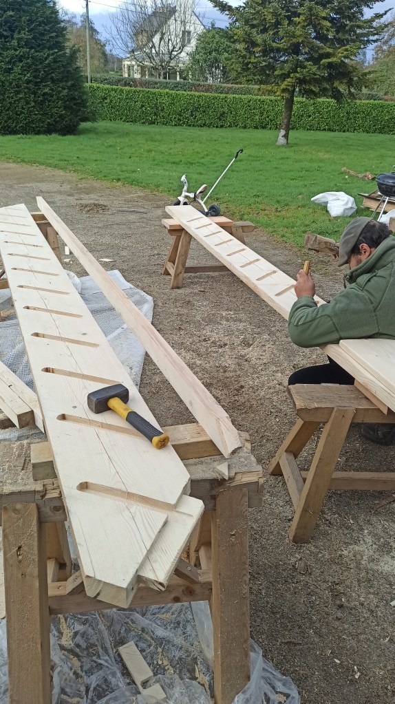 Après le dégauchissement d’un bois sec séchoir, trié sur le volet, il faut tracer les limons, les entailler ainsi que les poteaux, dégauchir les marches, les chanfreiner, entailler les mains courantes, avant d’emboiter le tout.