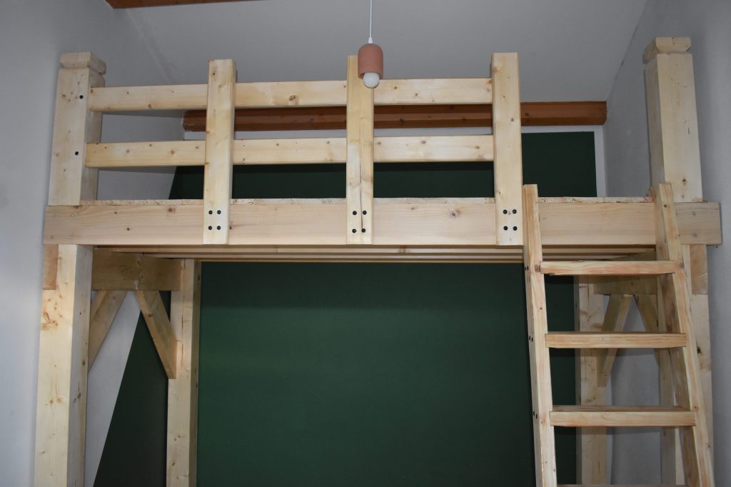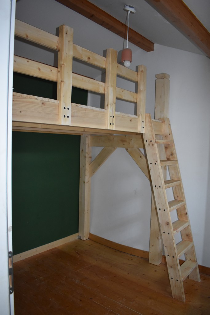 Nous avons construit cette petite mezzanine pour une chambre de famille nombreuse en Vendée, sur 4 pilotis (pour ne pas fragiliser le placo), avec un espace pouvant accueillir 1 lit double. Peut supporter tous les chahuts d’enfants, la rembarde et l’échelle ne bougera pas d’un yota !